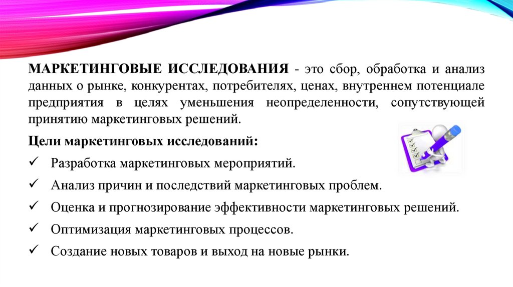 МАРКЕТИНГОВЫЕ ИССЛЕДОВАНИЯ - это сбор, обработка и анализданных о рынке, конкурентах, потребителях, ценах, внутреннем потенциале