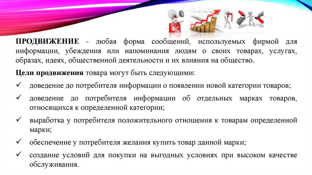 ПРОДВИЖЕНИЕ - любая форма сообщений, используемых фирмой дляинформации, убеждения или напоминания людям о своих товарах, услугах,