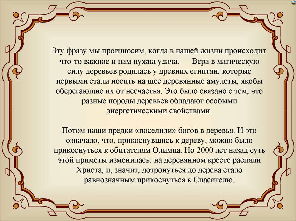 Эту фразу мы произносим, когда в нашей жизни происходитчто-то важное и нам нужна удача. Вера в магическую