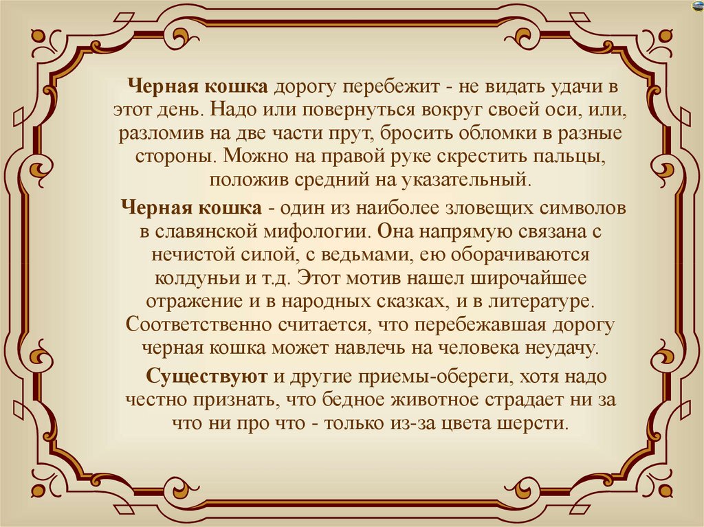 Черная кошка дорогу перебежит - не видать удачи вэтот день. Надо или повернуться вокруг своей оси, или,