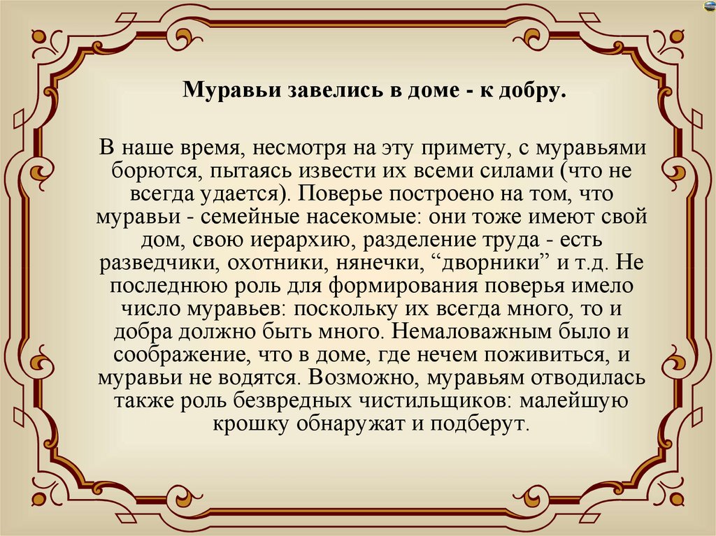 Муравьи завелись в доме - к добру.В наше время, несмотря на эту примету, с муравьями