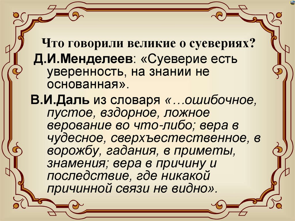 Что говорили великие о суевериях?Д.И.Менделеев: «Суеверие есть