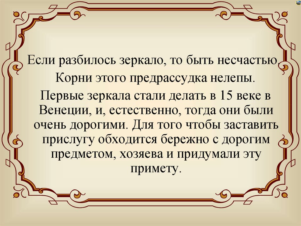 Если разбилось зеркало, то быть несчастью.Корни этого предрассудка нелепы.