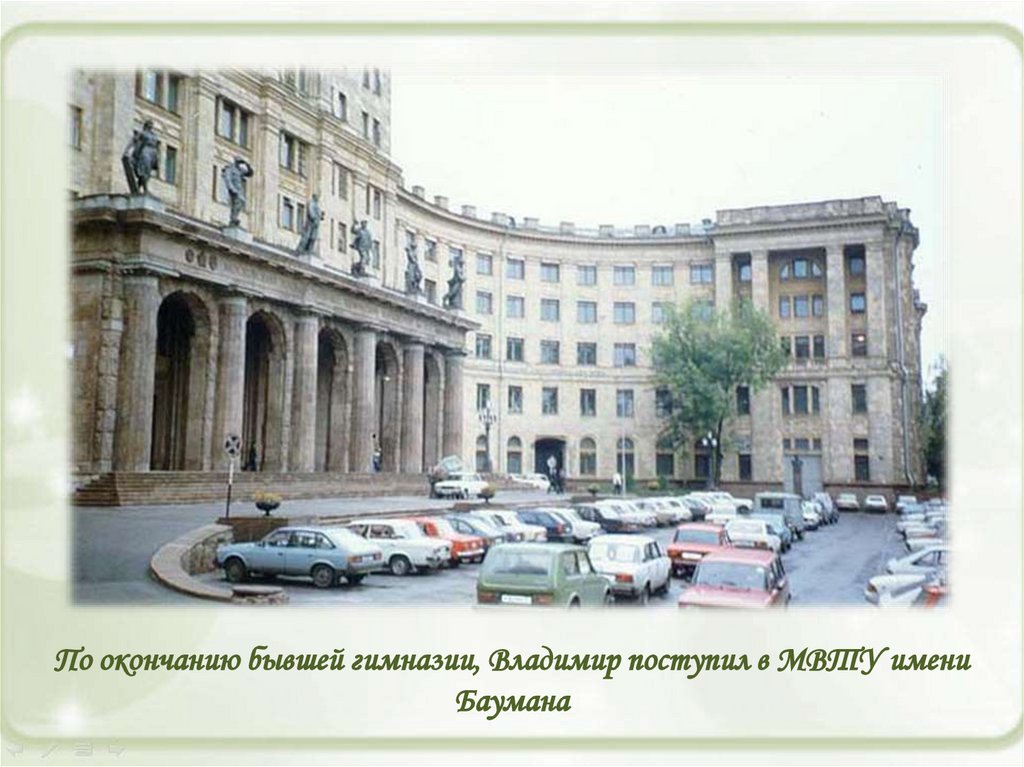 По окончанию бывшей гимназии, Владимир поступил в МВТУ имениБаумана