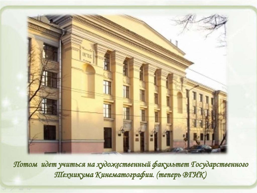 Потом идет учиться на художественный факультет ГосударственногоТехникума Кинематографии. (теперь ВГИК)