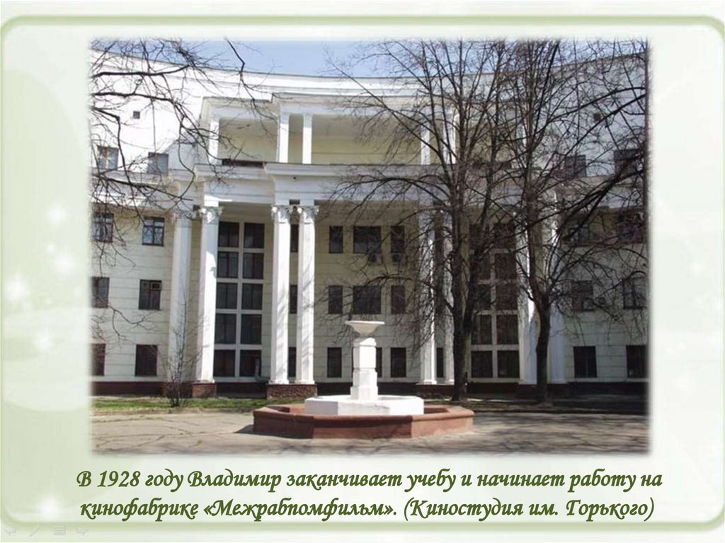 В 1928 году Владимир заканчивает учебу и начинает работу накинофабрике «Межрабпомфильм». (Киностудия им. Горького)