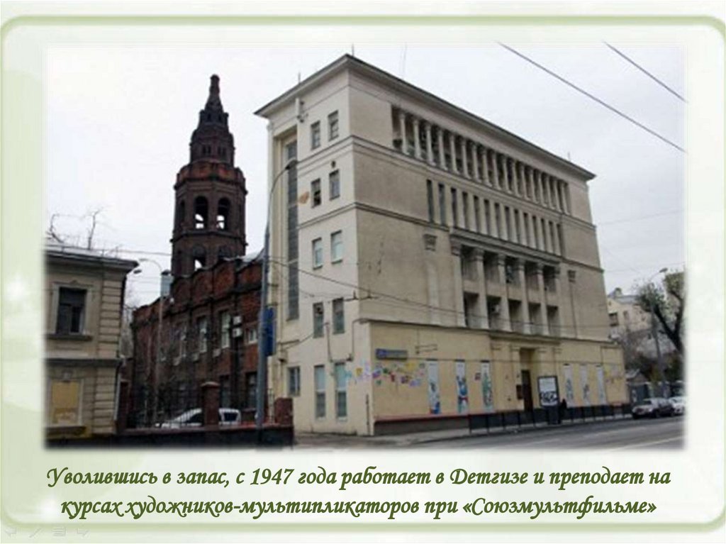 Уволившись в запас, с 1947 года работает в Детгизе и преподает накурсах художников-мультипликаторов при «Союзмультфильме»