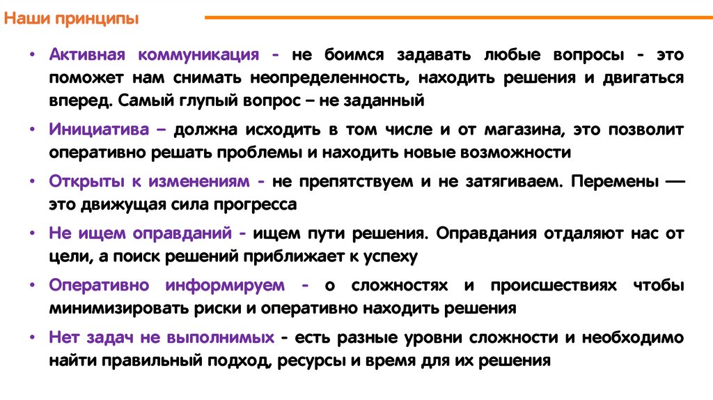 Наши принципы• Активная коммуникация - не боимся задавать любые вопросы - это