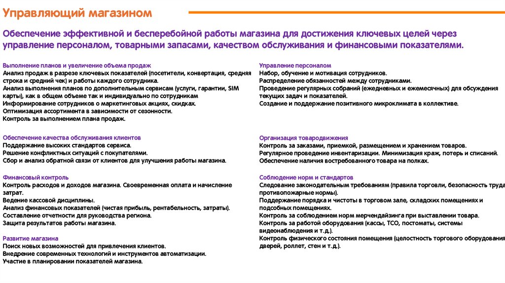 Управляющий магазиномОбеспечение эффективной и бесперебойной работы магазина для достижения ключевых целей через