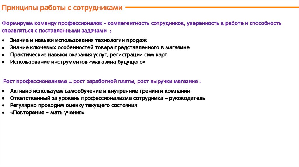 Принципы работы с сотрудникамиФормируем команду профессионалов - компетентность сотрудников, уверенность в работе и способность