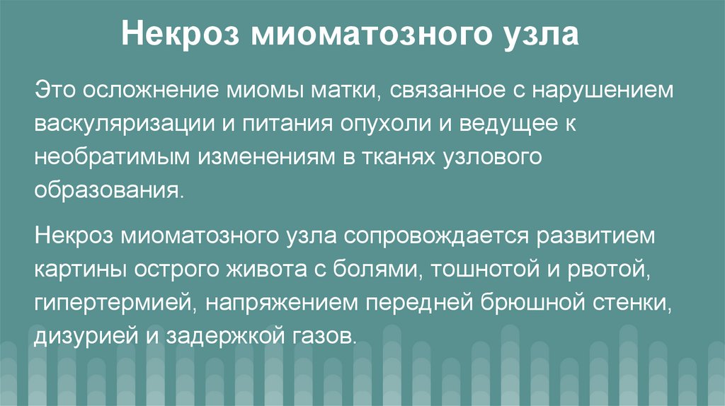 Некроз миоматозного узлаЭто осложнение миомы матки, связанное с нарушением