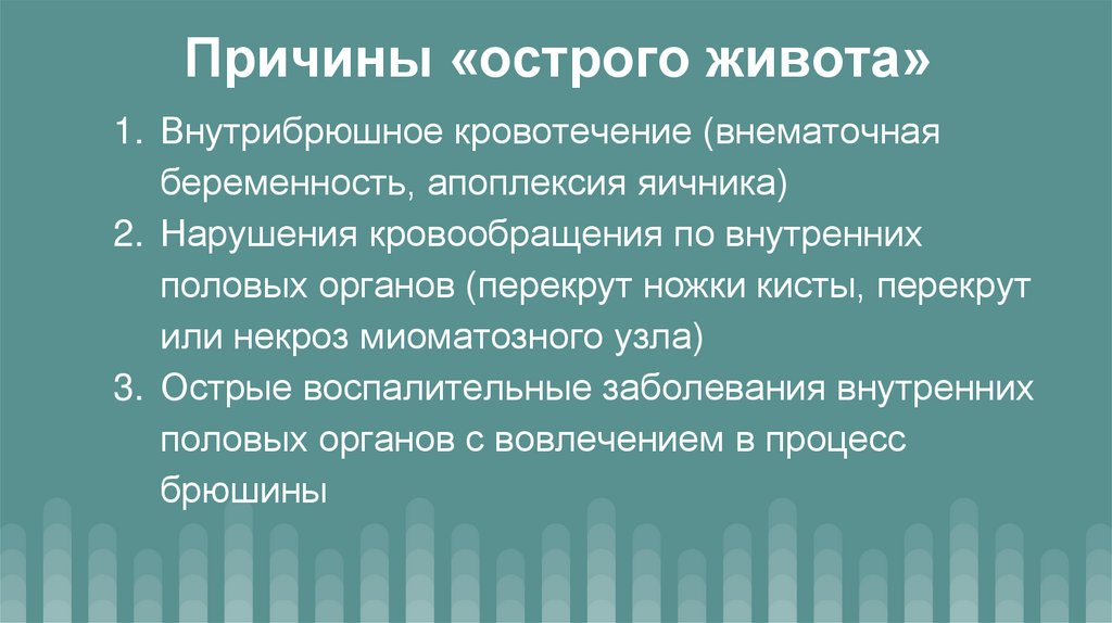 Причины «острого живота»1. Внутрибрюшное кровотечение (внематочная