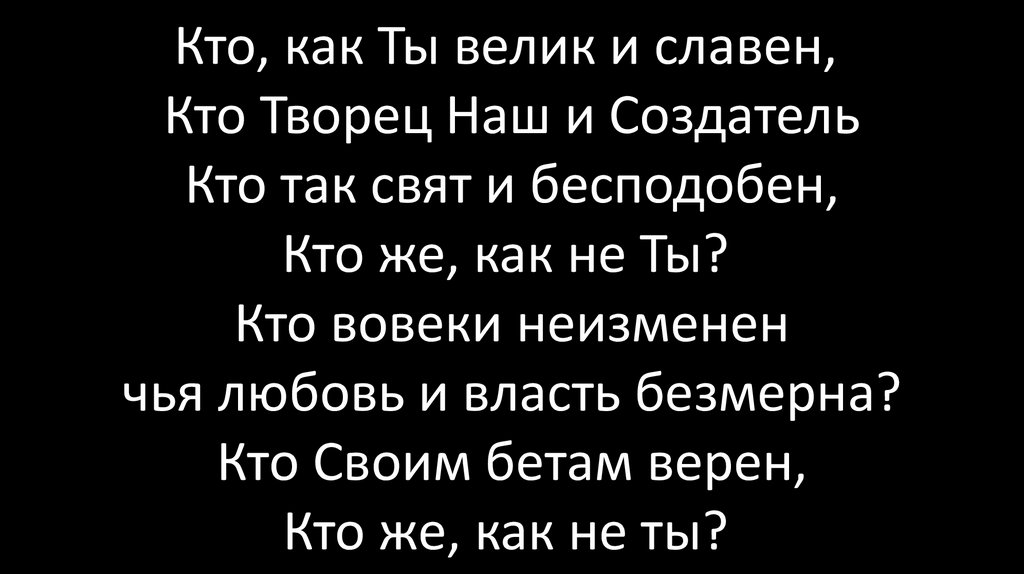 Кто, как Ты велик и славен,Кто Творец Наш и Создатель