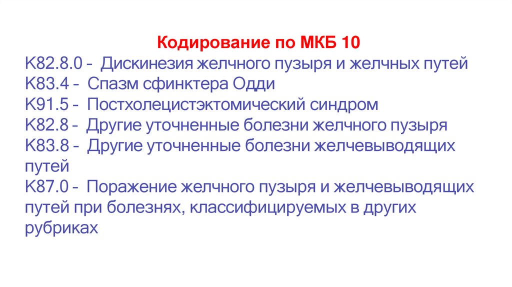 Кодирование по МКБ 10К82.8.0 – Дискинезия желчного пузыря и желчных путей