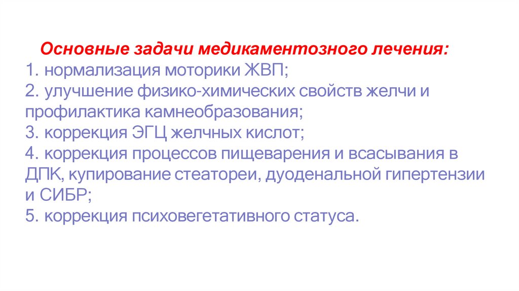 Основные задачи медикаментозного лечения:1. нормализация моторики ЖВП;