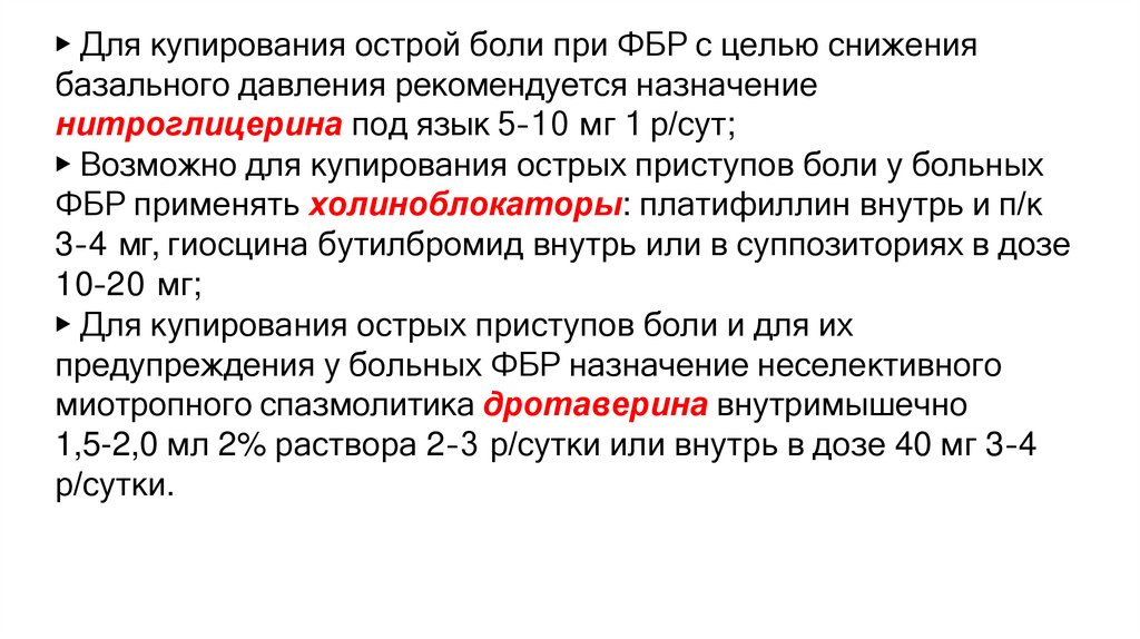▶ Для купирования острой боли при ФБР с целью снижениябазального давления рекомендуется назначение