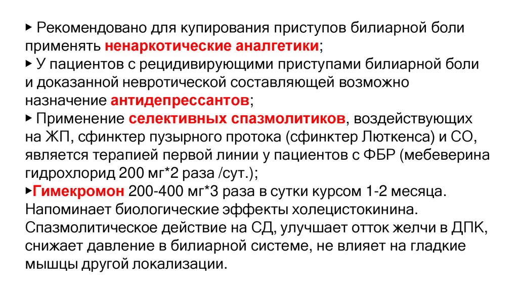▶ Рекомендовано для купирования приступов билиарной болиприменять ненаркотические аналгетики;
