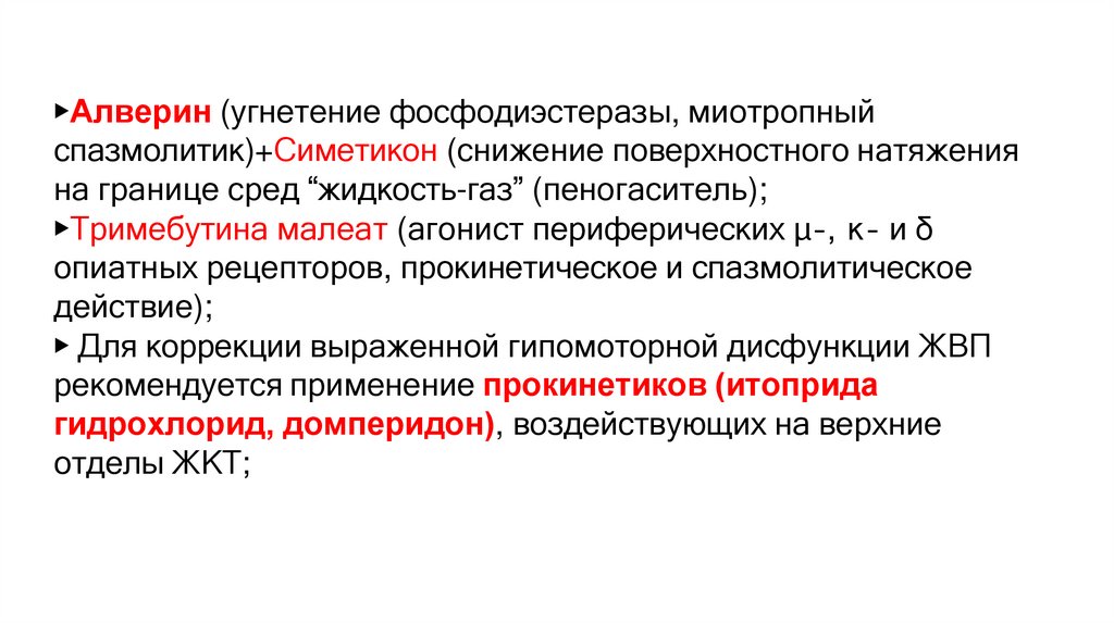 ▶Алверин (угнетение фосфодиэстеразы, миотропныйспазмолитик)+Симетикон (снижение поверхностного натяжения