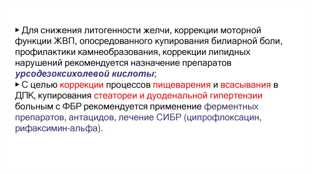 ▶ Для снижения литогенности желчи, коррекции моторнойфункции ЖВП, опосредованного купирования билиарной боли,