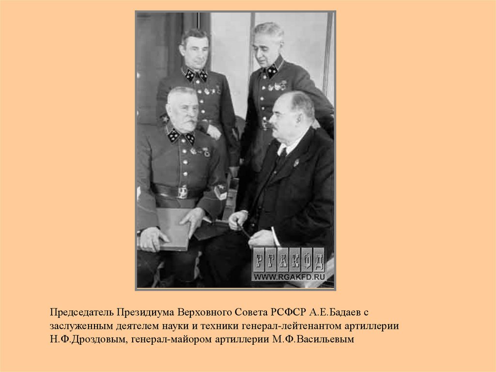 Председатель Президиума Верховного Совета РСФСР А.Е.Бадаев сзаслуженным деятелем науки и техники генерал-лейтенантом артиллерии