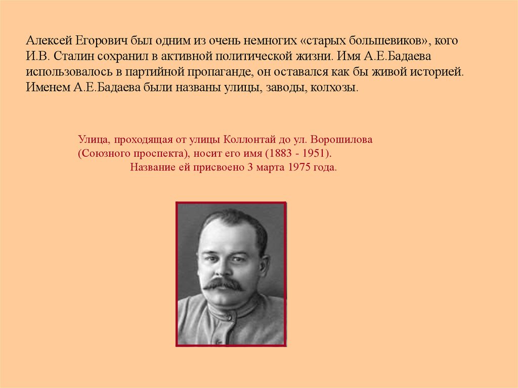 Алексей Егорович был одним из очень немногих «старых большевиков», когоИ.В. Сталин сохранил в активной политической жизни. Имя А.Е.Бадаева