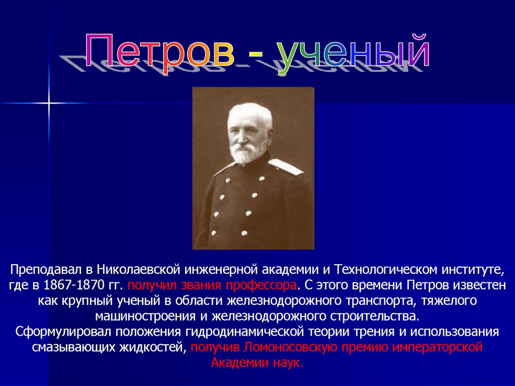 Преподавал в Николаевской инженерной академии и Технологическом институте,где в 1867-1870 гг. получил звания профессора. С этого времени Петров известен