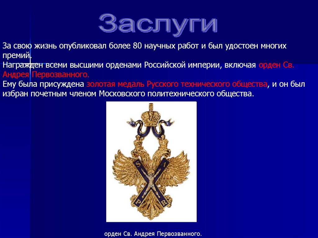 Ему была присуждена золотая медаль Русского технического общества, и он был