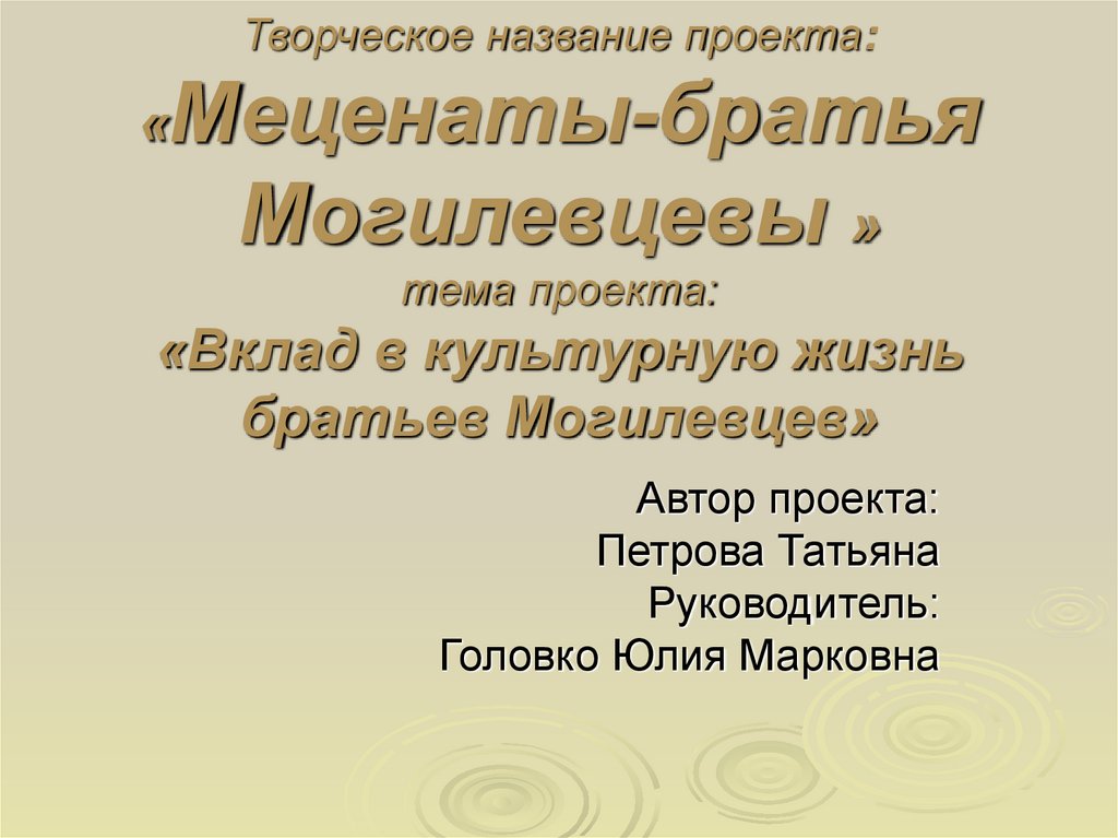 1. Творческое название проекта: «Меценаты-братья Могилевцевы » тема проекта: «Вклад в культурную жизнь братьев Могилевцев»