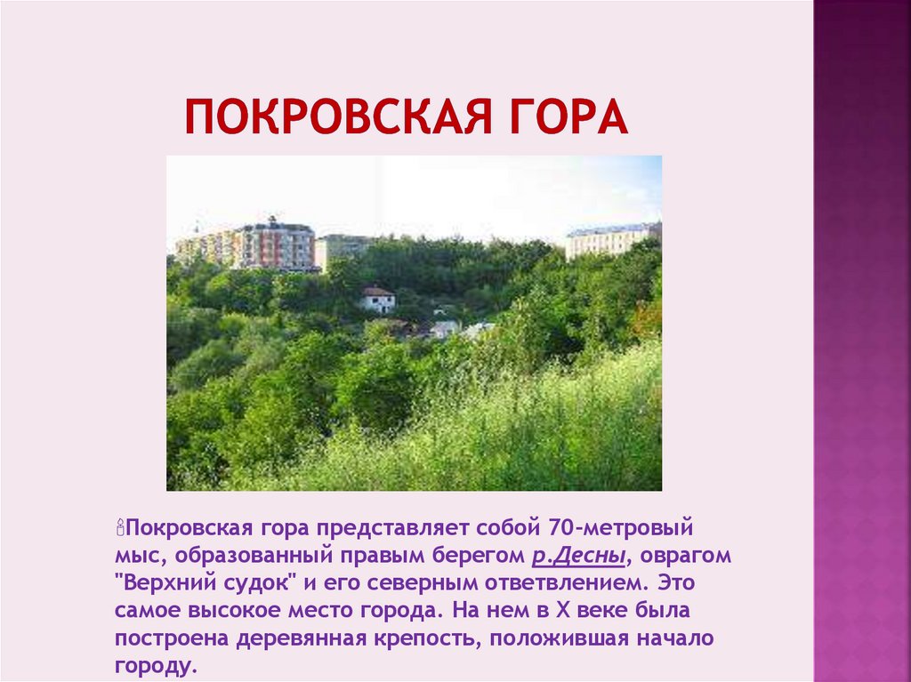 Покровская гора представляет собой 70-метровыймыс, образованный правым берегом р.Десны, оврагом