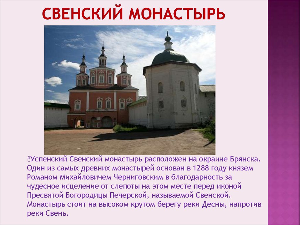 Успенский Свенский монастырь расположен на окраине Брянска.Один из самых древних монастырей основан в 1288 году князем