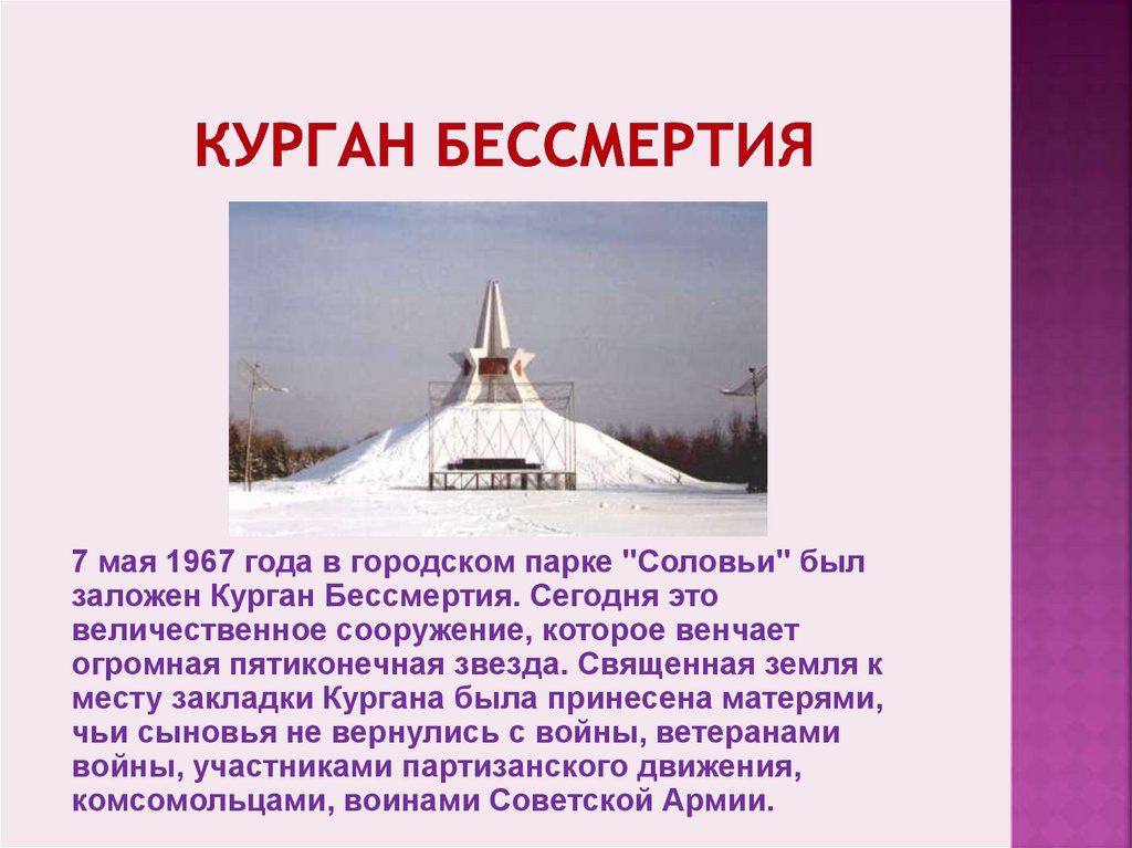 7 мая 1967 года в городском парке "Соловьи" былзаложен Курган Бессмертия. Сегодня это
