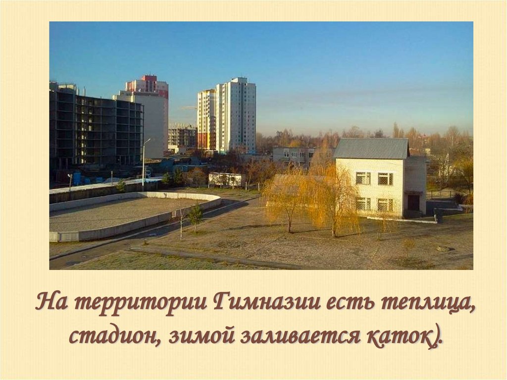 На территории Гимназии есть теплица,стадион, зимой заливается каток).