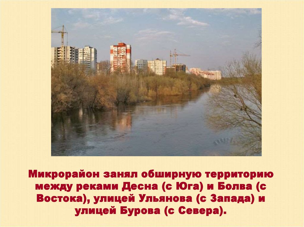 Микрорайон занял обширную территориюмежду реками Десна (с Юга) и Болва (с