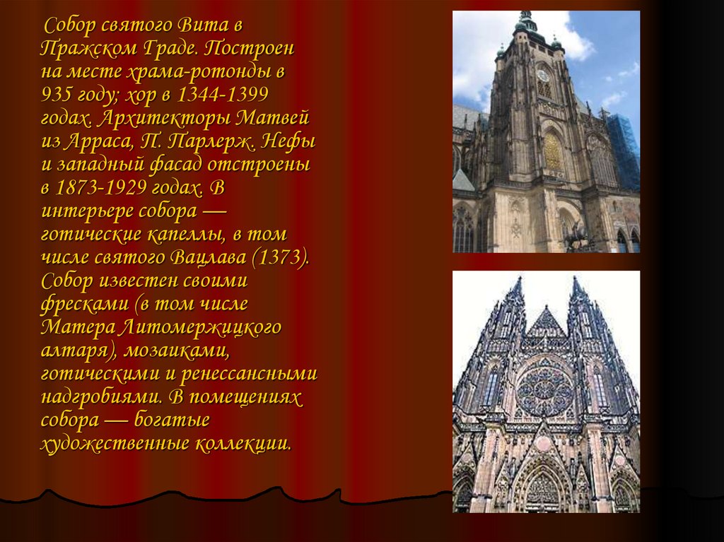 следует отнести готический собор св. Вита, в котором хранятся коронационные