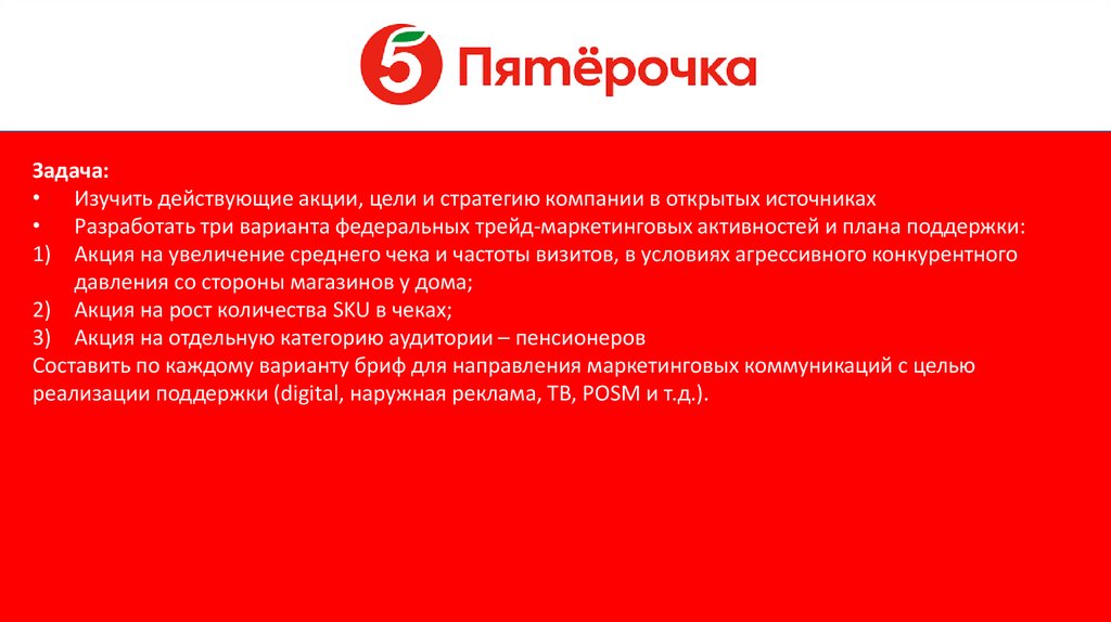 • Разработать три варианта федеральных трейд-маркетинговых активностей и плана поддержки: