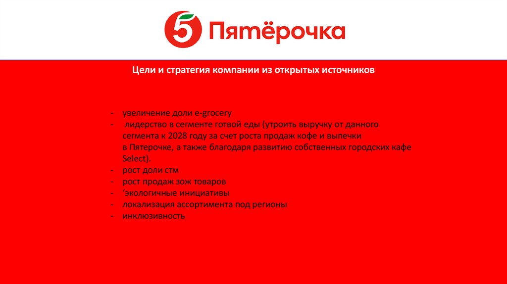 Цели и стратегия компании из открытых источников- увеличение доли e-grocery