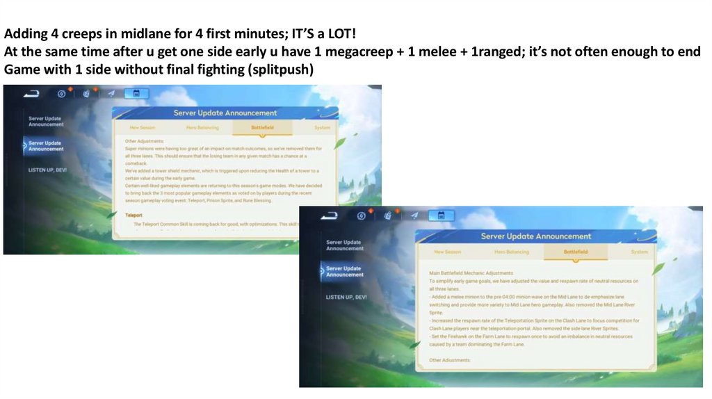 Adding 4 creeps in midlane for 4 first minutes; IT’S a LOT!At the same time after u get one side early u have 1 megacreep + 1 melee + 1ranged; it’s not often enough to end