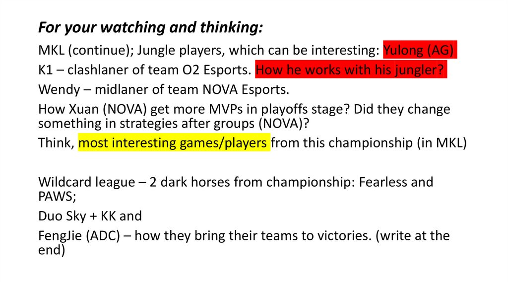 For your watching and thinking:MKL (continue); Jungle players, which can be interesting: Yulong (AG)