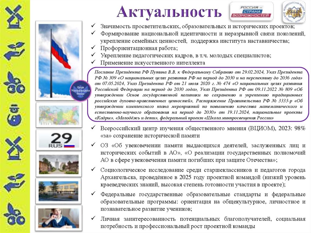 Значимость просветительских, образовательных и исторических проектов;Формирование национальной идентичности и неразрывной связи поколений,