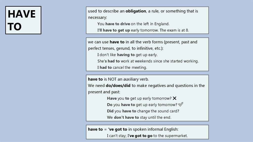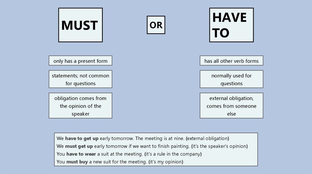 We have to get up early tomorrow. The meeting is at nine. (external obligation)