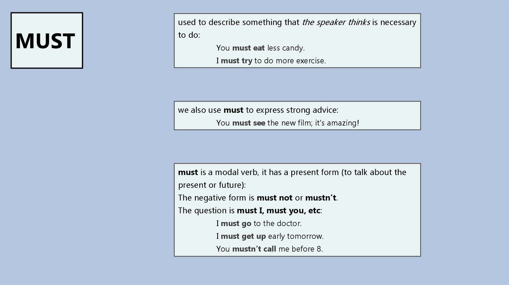 Children mustn’t eat chewing gum. = Children can’t/are not allowed to eat chewing gum.