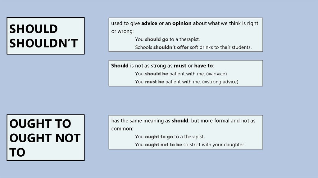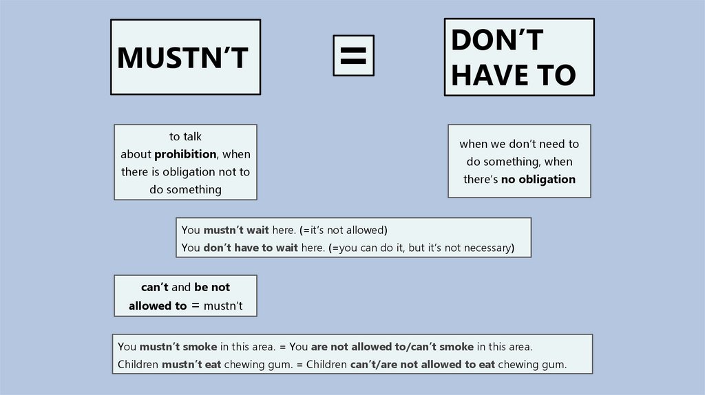 You mustn’t smoke in this area. = You are not allowed to/can’t smoke in this area.