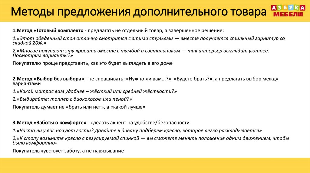 Методы предложения дополнительного товара1.Метод «Готовый комплект» - предлагать не отдельный товар, а завершенное решение: