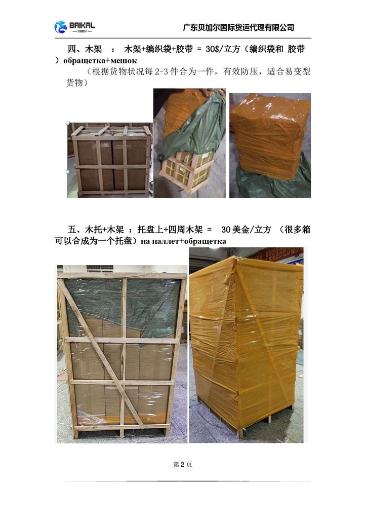 广东贝加尔国际货运代理有限公司四、木架 木架+编织袋+胶带 = 30$/立方 编织袋和 胶带