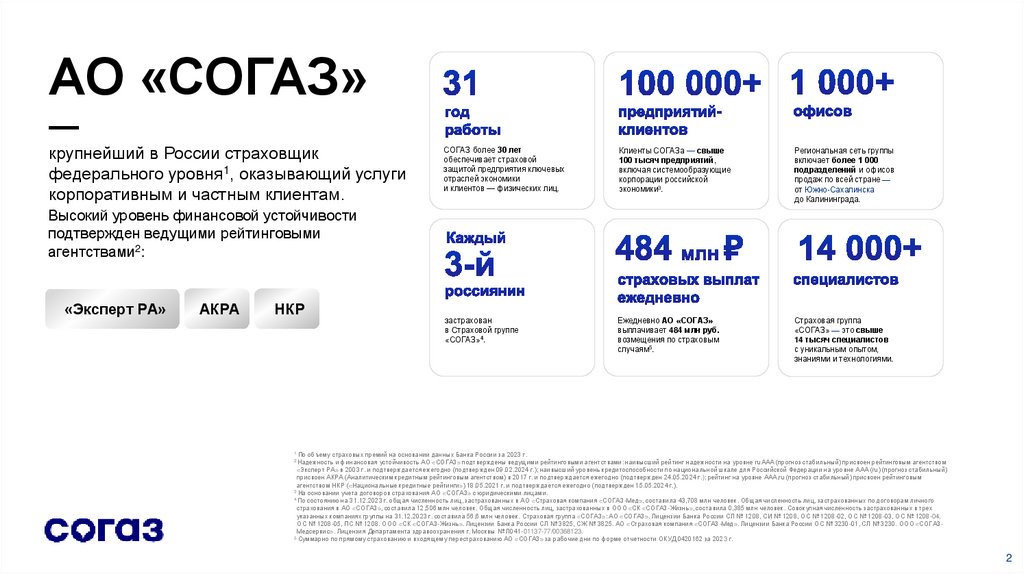 2 Надежность и финансовая устойчивость АО «СОГАЗ» подтверждены ведущими рейтинговыми агентствами: наивысший рейтинг надежности на уровне ruAAA (прогноз стабильный) присвоен рейтинговым агентством