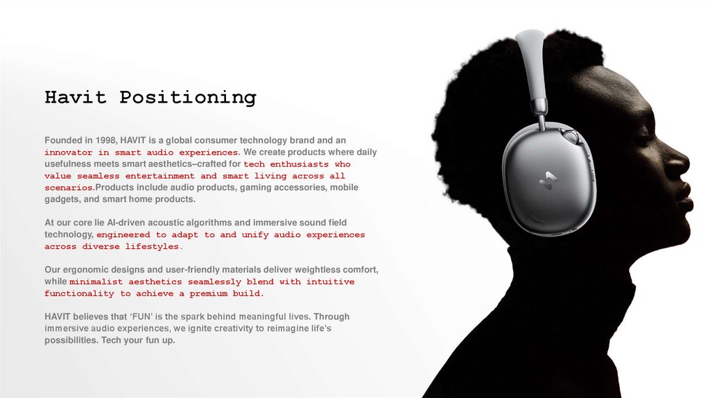 Havit PositioningFounded in 1998, HAVIT is a global consumer technology brand and an