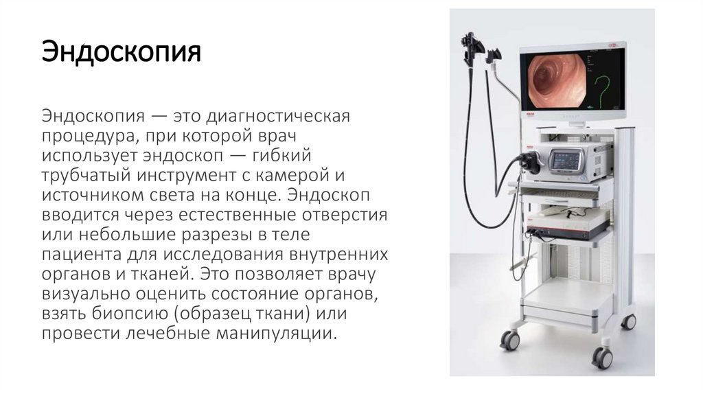 Виды эндоскопии:1. Гастроскопия (эзофагогастродуоденоскопия, ЭГДС): исследование пищевода, желудка и