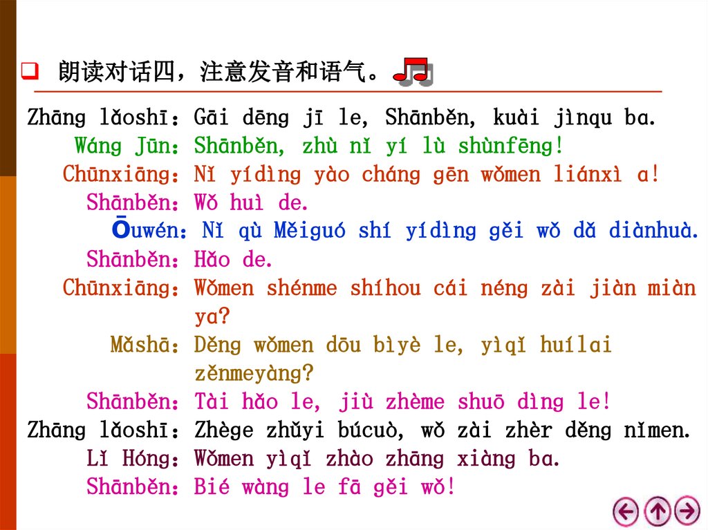 朗读对话四 注意发音和语气。Zhānɡ lǎoshī Gāi dēnɡ jī le, Shānběn, kuài jìnqu bɑ.