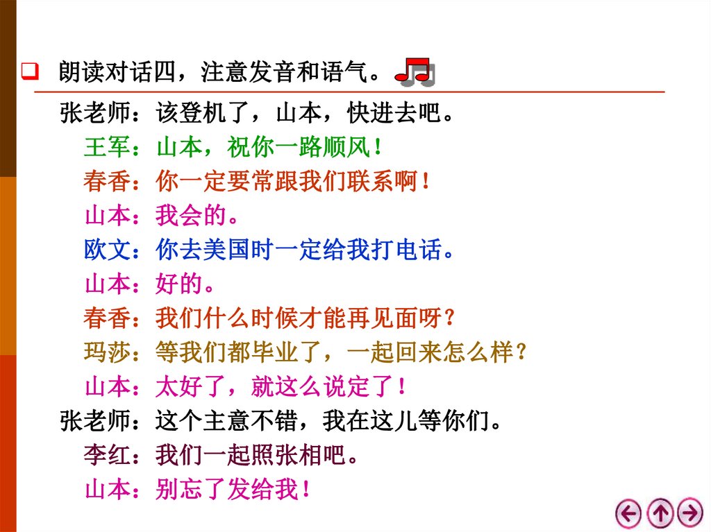 朗读对话四 注意发音和语气。张老师 该登机了 山本 快进去吧。