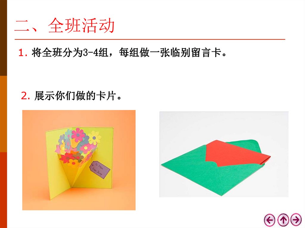 二、全班活动1. 将全班分为3-4组 每组做一张临别留言卡。